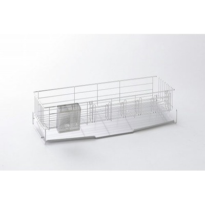 シンクサイズに合わせて2タイプから選べます。省スペースに置けるので空間を有効活用。深皿や平皿など様々な形状の食器が安定して置けるようにバスケットの底を前側と後ろ側で異なったワイヤー間隔にしています。グラスを6個掛けられるホルダーはRびんやマグボトル、鍋蓋も掛けられる優れモノ。
