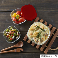 耐熱ガラスの保存容器。フタをしたまま電子レンジ、フタを外してオーブン調理にも使えます。角に丸みがありそのまま食卓に出しても違和感のないフォルムです。