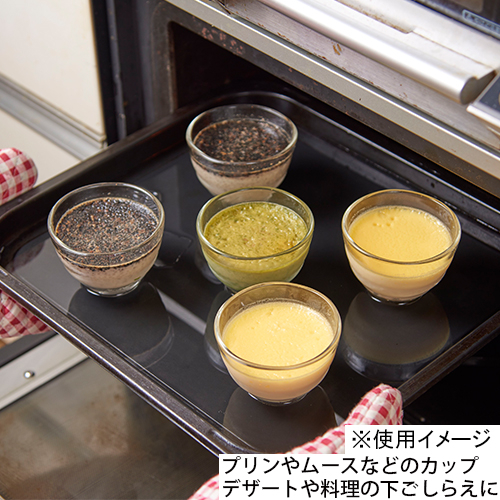 電子レンジ・オーブンに使える耐熱ガラスカップ。プリンやムースなどのカップデザートに、またお料理の下ごしらえなどにも活用でき便利です。スタッキングでコンパクト収納