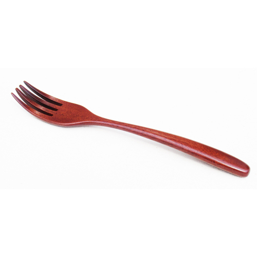 木製スプーン愛用者の要望から生またフォーク。スプーンとおなじ丈夫な赤木材に、生漆を摺り込んだシンプルなつくり。握りやすい太目の持ち手と、マルチユースの4 本爪です。