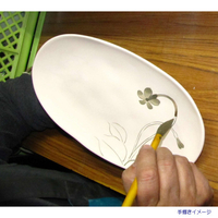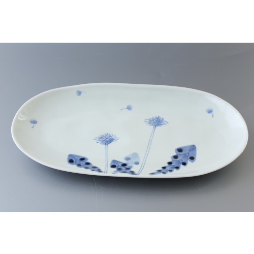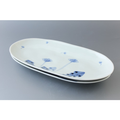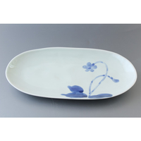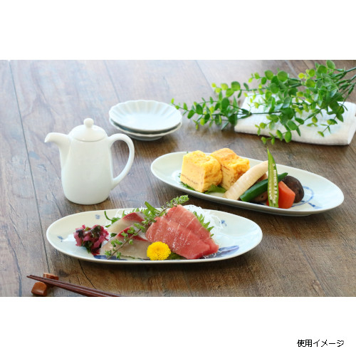波佐見焼の楕円皿に、一枚一枚丁寧に絵付けしています。細長い形状は食卓で場所をとりません。焼魚やお刺身、一人分のおかずなどに。