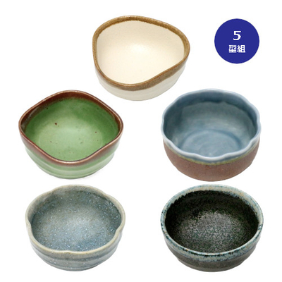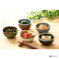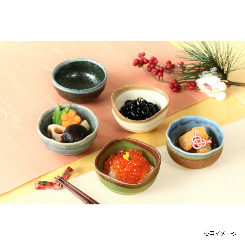 花、波型、丸、三角、四角の5種の形と色の小鉢で、さまざまな料理と合わせやすい落ち着いた雰囲気が魅力。副菜やデザートなどを盛って日々の食卓に。