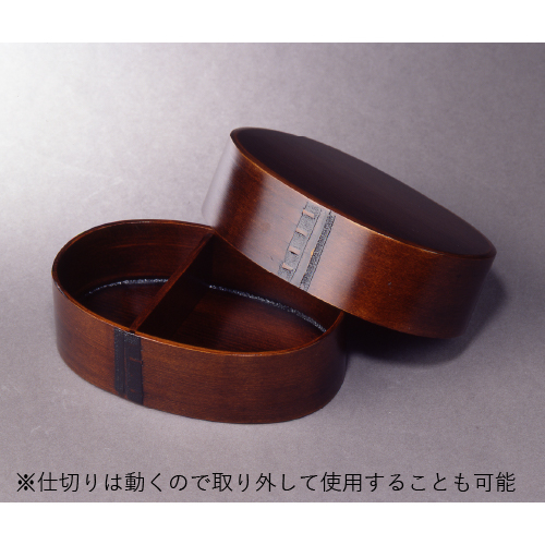 ●曲げ輪部:ひのき、天板・底:さわら・桜皮(漆塗装)、仕切り:ひのき(漆塗装)●16×10.8×高5.5cm、内寸:14.8×9.3×深3.8cm 、仕切り:9.1×3.4×厚0.4cm●90g●容量/400ml●日本製*電子レンジ・食洗機・乾燥機使用不可。*漆は体調、体質によりごくまれにかぶれる場合があります。その際は直ちに使用を中止し、できるだけ早く医師の診断を受けてください。