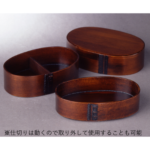 ●曲げ輪部:ひのき、天板・底:さわら、桜皮(漆塗装)、仕切り:ひのき(漆塗装)●16×10.8×高9cm、内寸:14.8×9.3×深上段:3cm下段:3.8cm、仕切り:約9.1×2.7×厚0.4cm●145g●容量:上段350ml、下段400ml●日本製*電子レンジ・食洗機・乾燥機使用不可。*漆は体調、体質によりごくまれにかぶれる場合があります。その際は直ちに使用を中止し、できるだけ早く医師の診