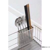 引っ掛け部はすき間に余裕があるので、プラスチック製の水切りにも使えます。薄型でも縦長なので箸・スプーン・キッチンツールが楽々入ります。一般的な箸立てよりも1〜2cm薄く、その分お皿が1〜2枚多く水切りに入ります。