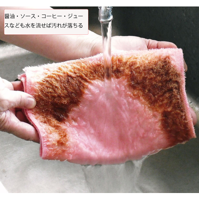 しょうゆ、ソース、コーヒー、ドレッシング等の食卓の汚れに。軽い油汚れなら洗剤なしで拭き取れます。