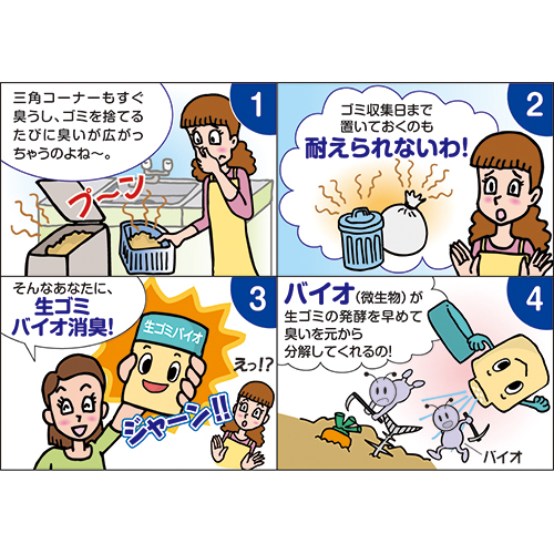 微生物の力で消臭する、環境にやさしいバイオの生ゴミ消臭剤です。三角コーナー、ゴミ箱などに振りかけるだけで、すばやく悪臭の元を除去します。
