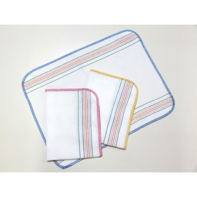 岡山県倉敷市で作られた食卓用ふきん3色組です。太めの糸で粗めのニット編み、縁どりはしっかりした縫製です。