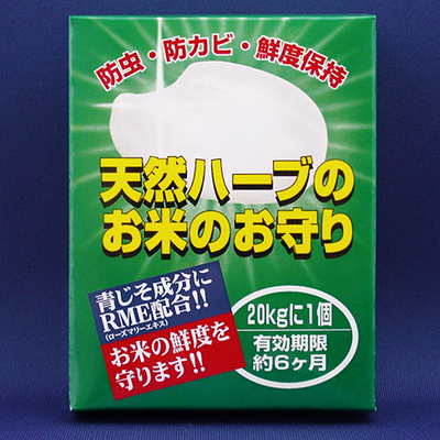 青じそ成分がお米を害虫やカビから守り、ローズマリーエキスが鮮度とおいしさを守ります。20kgの米びつに1個が目安。