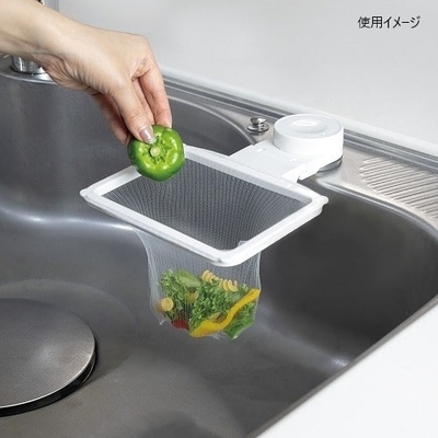 ●本体:ABS、吸盤:TPU、ネット:ポリエステル●幅16×奥行21.5×高さ3cm、間口:14.8×9.8cm●お試し用ネット50枚付、市販の排水口用水切りネットが使用可能●中国製