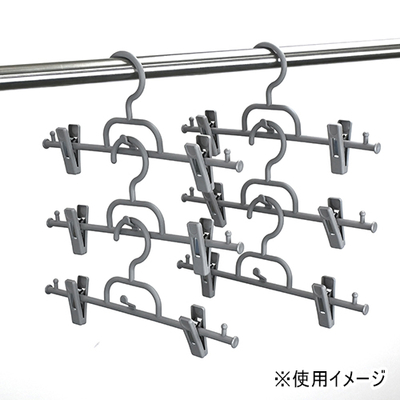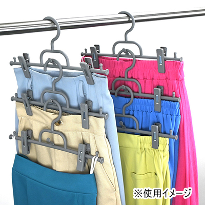 狭いクローゼット内でもスカートやスラックスをスッキリ収納できるハンガーです。連結フック付なのでスペースを有効活用できます。左右にスライドするクリップ付で、収納する衣類の用途に合わせて幅が調整できます。