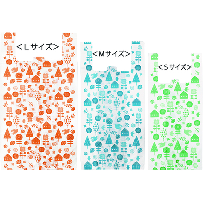 ●ポリエチレン●S:21×46×マチ13cm、厚0.015mm、M:26×50×マチ14cm、厚0.015mm、L:30×55×マチ15cm、厚0.018mm(持ち手含む)●容量:S:約8L、M:約10L、L:約15L●耐冷温度:-30℃●中国語