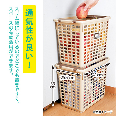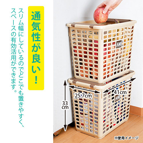 スリム幅にしているのでどこでも置きやすく、また積み重ねができるのでスペースの有効活用ができます。玉ねぎ、じゃがいもなど買い置きしておきたい野菜の収納に。2段に積み重ねて使用できます。