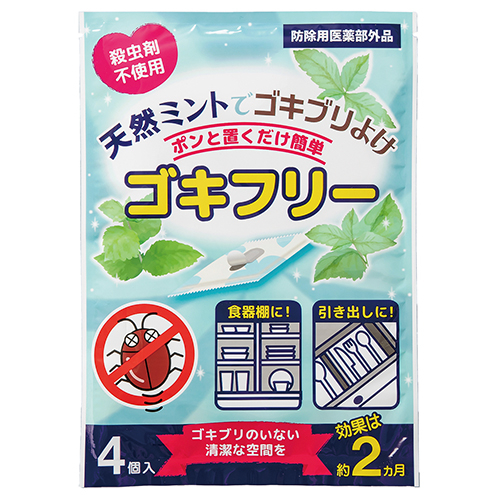 引き出しなどにポンと置くだけ!簡単にゴキブリがいなくなる清潔な空間をつくります。「寄せ付けない」タイプのゴキフリー。餌で殺虫するタイプと違いそもそもゴキブリを寄せ付けません。