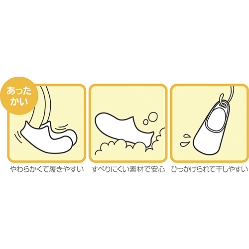 やわらかくて履きやすい。すべりにくい素材で安心。ひっかけられて干しやすい。足を包み込んでくれるので、水が入りにくく、あたたかい。ひっかけられて干しやすい。