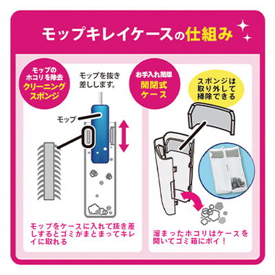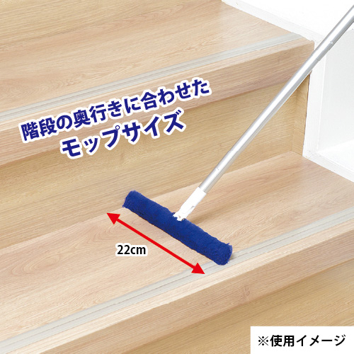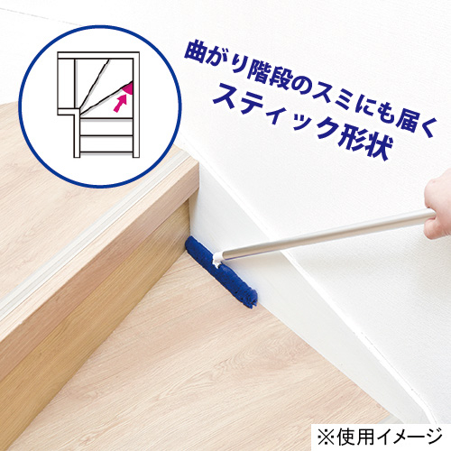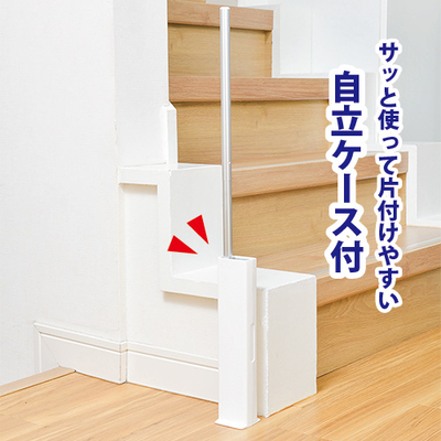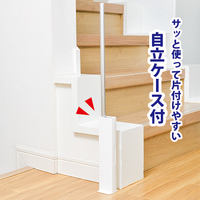 狭い階段でも取り回しのしやすいショート柄タイプ。スティック状のモップなので、曲がり階段の角等にも届きやすい。モップはケースに通すとキレイになり、ホコリは徐々にまとまって溜まります。自立して収納できるケース付きなので、手に取りやすい場所に置きやすく、いつでもサッとお掃除できます。