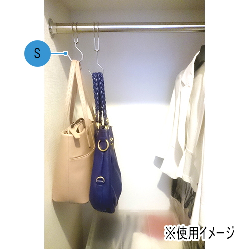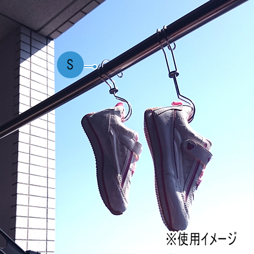 まわるS字フックです。回転することで多用途に使用できます。屋外のランドリー用として、洗ったスニーカーを干したり、ピンチカゴを掛けて使うときに便利です。ランドリー用だけでなく、クローゼット内の収納においても利便性がありバック掛けや帽子などの収納に便利です。向きを変えたりして、収納スペースを少なくすることもできます。