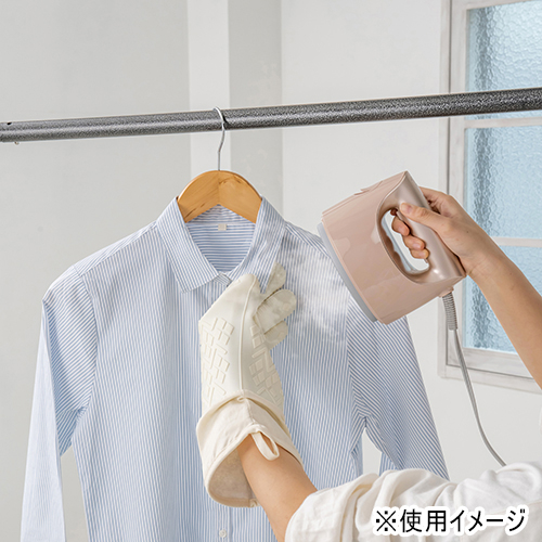 襟や裾などの細かいところも簡単につまむことができます。手を守るロングタイプです。手首の上までしっかりガードして、スチームの熱から手を守ります。左右両方で使用していただけます。ループ付きなのでフックなどに掛けられます。