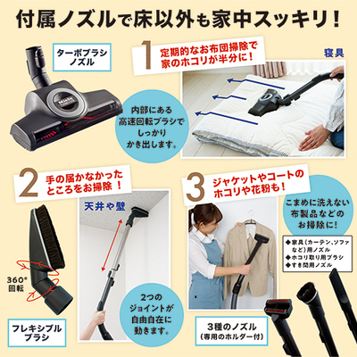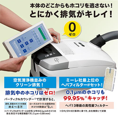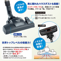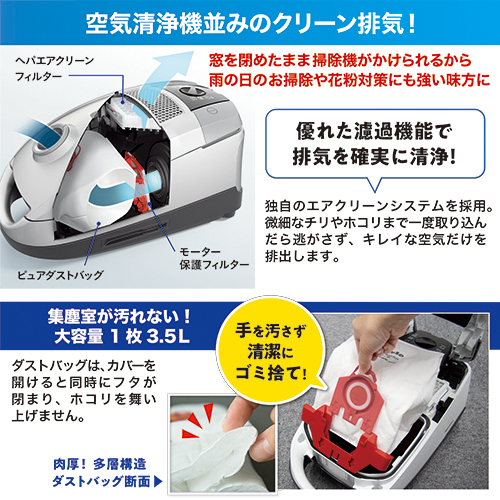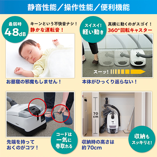 花粉・ダニ・アレルゲン対策の決定版!丈夫で長く使える長寿命設計でクリーン排気の掃除機です。独自のエアクリーンシステムで、本体のどこからもホコリを漏らしません。窓を閉めたままでも、掃除機がかけられるので、雨の日のお掃除や花粉対策にも、強い味方です。隠れたゴミを取る力、「ダストピックアップ率」がフローリング床で90.0%※、カーペットで84.9%※と世界レベルを実証しています。(※試験機関:SLG Pruf-und Zerf ierungs GmbH)運転音は最弱時で48dBと静かです。