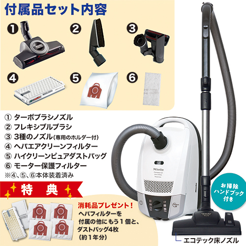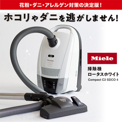 ●型式/Compact C2 SDCO 4 ●電源/100V 50/60Hz ●消費電力/1000W ●ダストピックアップ率/【フローリング】90.0%、【カーペット】84.9% ●吸込仕事率/220W ●運転音/48dB(最弱時) ●材質:本体(ABS樹脂、ポリプロピレン)、ホース(ポリエチレン)、延長管(ステンレス)、ノズル(ポリプロピレン) ●本体サイズ/幅25×奥行43×高さ23cm ●重