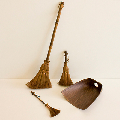 ●柄:黒竹(テーブルほうきの柄=竹)、穂:棕櫚、ちりとり:紙(柿渋塗り)●ほうき大:幅15×奥行4×全長60cm、小:幅10×奥行3.5×全長24cm、テーブルほうき:幅7×奥行2.5×全長26.5cm、ちりとり:23×21×高さ6.5cm●ほうき大:120g、小:46g、テーブルほうき:16g、ちりとり:60g●日本製(棕櫚・黒竹・竹/原産国:中国、ちりとり:紙/原産国:日本)※セット内容:棕櫚