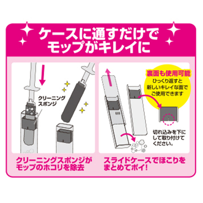 モップはケースに通すとキレイになり、ホコリは徐々にまとまって溜まります。ケースに溜まったホコリはまとめてポイ!いつでもサッとお掃除できます。伸縮タイプなので、照明やエアコンなどの手の届かない高い所や、家具・家電のスキマなどに便利。ヘッドは清掃場所に合わせて傾けることができます。