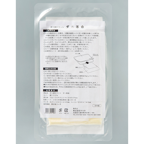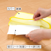 ●本体(カバー):綿100%、誘引剤:フルーツエキス入りマイクロカプセル●粘着シート:紙+粘着剤+ガーゼ●本体(カバー):20.5×29.5cm、粘着シート:25×14.5cm●セット内容:本体(カバー)・誘引剤・粘着シート各1●日本製※効果持続期間:開封後約3ヶ月※使用目安:3㎡に1枚