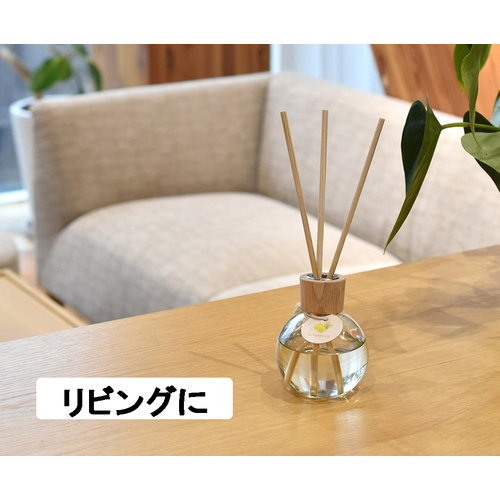 明るくポジティブでフレッシュなビターシトラスの香り。丸みのあるデザインは、安定感があり倒れにくくなっています。スティックは、国産の杉間伐材を使用。最後までしっかり香りが広がります。