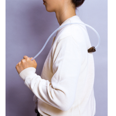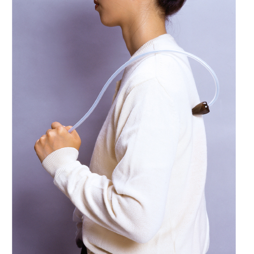 人が行う指圧のような感覚を出すためアームに特殊鋼を用い、体との接点と握り部分は天然木を使用。ポイントに当てて手前に引きます。肩甲骨の間にも。