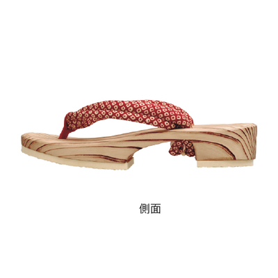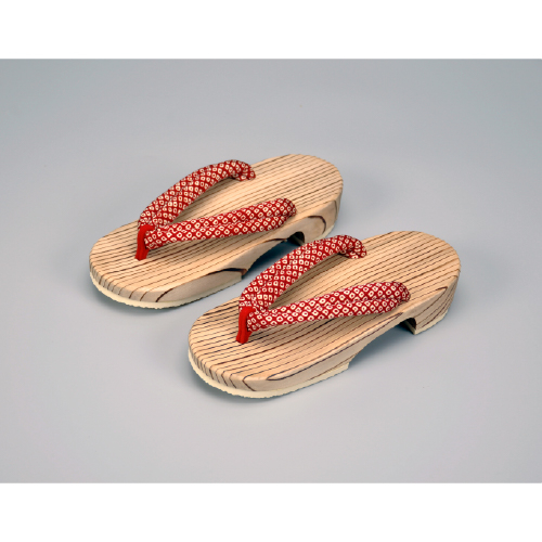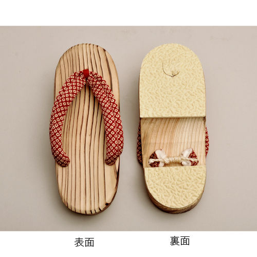 木目の模様が映える焼加工仕上げ。大分県日田地方の日田杉を使用しています。やさしい履き心地で、ゆるやかなカーブが足裏にフィット。裏側は音がしにくい素材を使用し、歩行時の音を軽減。馬の背にある斑点に似た絞り染めの鹿の子柄。