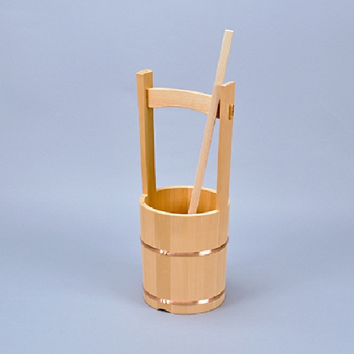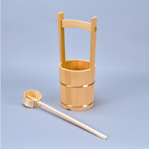 ●桶:さわら、タガ:銅、柄杓:ひのき、桜皮●桶:径18×高46cm(持ち手含む)21cm(持ち手含まない)、柄杓:径9×全長54cm●桶:580g、柄杓:50g●日本製
