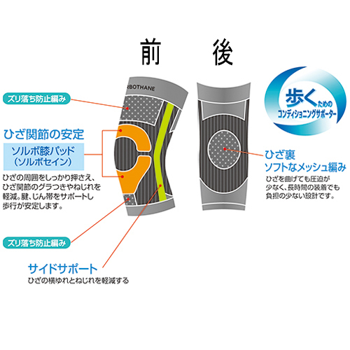 ●本体:ナイロン、ポリウレタン、パッド:ポリウレタン樹脂(ソルボセイン)●適応サイズ:ひざ上周り(膝皿上10cm部分)46〜50cm●片足入り●左右兼用●手洗い可●日本製※血圧の高い方、心臓に障害がある方、血行障害を起こした事がある方は使用しないでください。