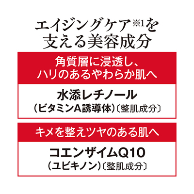 ・低刺激エイジングケア乳液です。・整肌成分の水添レチノール、コエンザイムQ10と、メロン胎座エキス(植物プラセンタ)、コメ発酵エキスなど5種のうるおい成分を配合しました。・敏感肌パッチテスト済み。スティンギングテスト済み。(スティンギングテストとは、塗布した時の皮膚への刺激(ピリピリ・ヒリヒリ感)を確かめるテストです。)※すべての方に皮膚刺激が起きないというわけではありません。