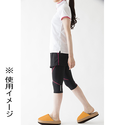 体の重心を後ろに意識させることで、下腹、ヒップ、ふくらはぎにキュッと力が入り体幹が鍛えられ体のラインを整えるスリッパです。