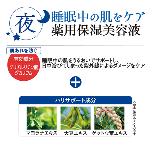 ・肌あれを防ぐ有効成分グリチルリチン酸ジカリウムと、ハリサポート成分のマヨラナエキス、大豆エキス、ゲットウ葉エキスを配合した薬用美容液です。・医薬部外品