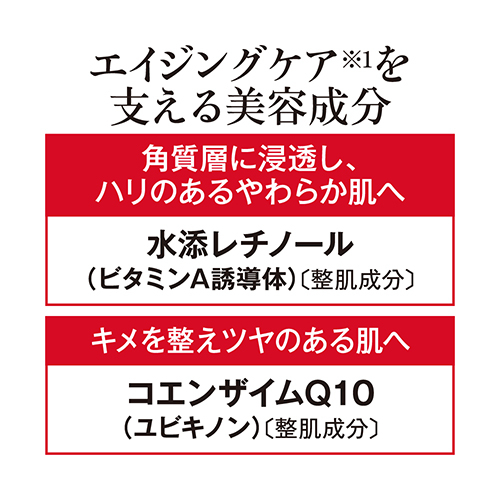 ・低刺激エイジングケア化粧水です。・整肌成分の水添レチノール、コエンザイムQ10と、メロン胎座エキス(植物プラセンタ)、コメ発酵エキスなど5種のうるおい成分を配合しました。・敏感肌パッチテスト済み。スティンギングテスト済み。(スティンギングテストとは、塗布した時の皮膚への刺激(ピリピリ・ヒリヒリ感)を確かめるテストです。)※すべての方に皮膚刺激が起きないというわけではありません。