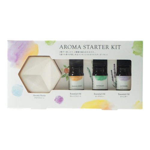 アロマを始めたい方におすすすめの、エッセンシャルオイル3種(オレンジスイート/ラベンダー/ローズマリー)と素焼きのストーンのセットです。