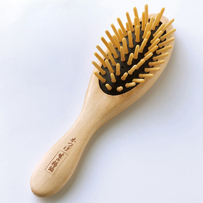ピンの先を丸く加工したつげのブラシ。弾力のあるクッションなので、地肌を傷めにくく心地よい刺激を与えます。静電気が起こりにくいです。