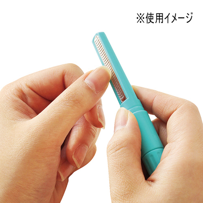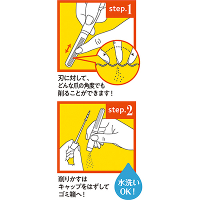 削りから仕上げまで1本でできる新発想のつめ削りです。削りカスが落ちないので、周りを汚す心配がありません。削りカスは本体内部に入り、あとでまとめて捨てられます。収納や携帯に便利なペン型。