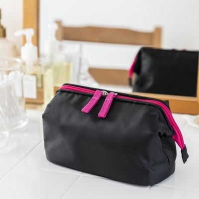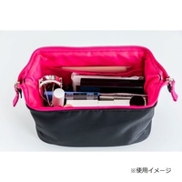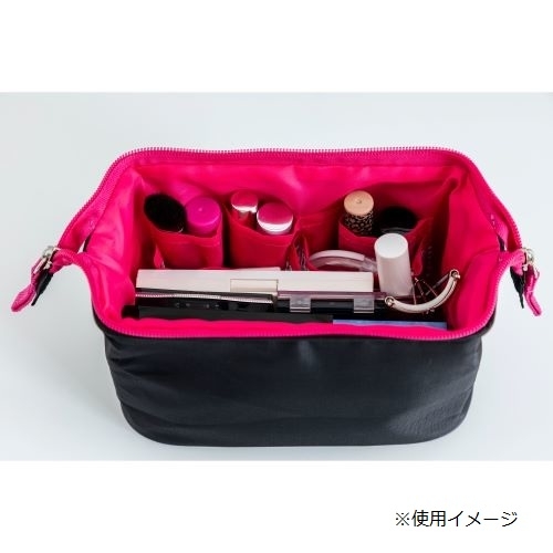 小さなメイク道具も探しやすくて、取り出しやすいサイズ。ワイヤー入りで、取り出しに便利なガバッと開閉。リップやチークなどの小分けに整理できる内ポケット付き。