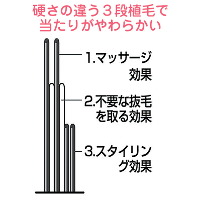 固さの違う3段植毛で、当たりが柔らかです。毛足が長く、もっともソフトな1段目が、マッサージ効果で血行を促します。2段目、3段目には適度なコシがあり、髪のもつれをときほぐし、きれいな髪の流れを作ります。