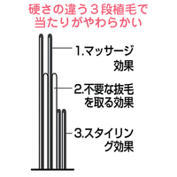 固さの違う3段植毛で、当たりが柔らかです。毛足が長く、もっともソフトな1段目が、マッサージ効果で血行を促します。2段目、3段目には適度なコシがあり、髪のもつれをときほぐし、きれいな髪の流れを作ります。