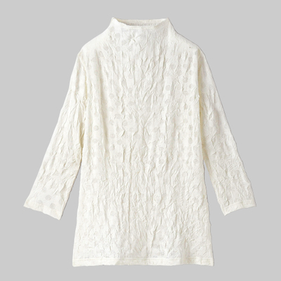 大人可愛い6分袖の水玉ジャカード柄。首回りはボトルネックで伸びのあるカットソー素材。