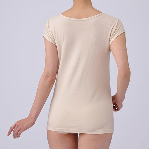 肌に当たる内側はシルクニット、外側はコットン。2つの素材を特殊な編み機で二重仕立てにしました。シルクの放湿性とコットンの吸湿性を併せ持つ、ソフトでしなやかなガーゼタッチのインナーです。今までにない、気持ちいい肌ざわりを体感してください。