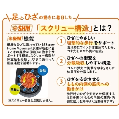 踵部のスクリュー構造の働きで衝撃を分散吸収し歩行をサポートするSHM機能搭載のウォーキングシューズ。フォーマルシーンにも使えるデザインです。