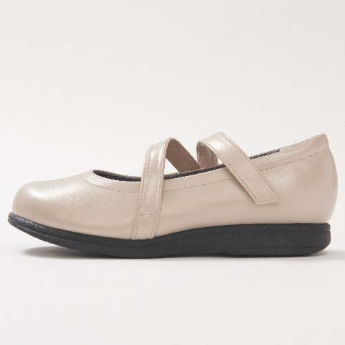 折り返しのベルトでしっかりとフィットするカジュアルパンプス。ゆったり4Eワイズなので幅広甲高の方にもおすすめです。甲がしっかり押さえられるので、足がブレず軽快に歩けます。