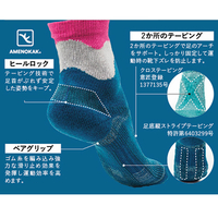 奈良県の国産靴下メーカーと近畿大学が共同で企画した靴下です。特許技術の衝撃緩和機能で、足の負担を軽減します。スポーツや散歩を楽しむ方はもちろん、立ち仕事の方へにもおススメです。アメノカクとは古事記に登場する鹿の神で、険しい山々を駆け巡る健脚の持ち主です。くるぶしから足首のグラデーションデザインは、山をイメージしました。