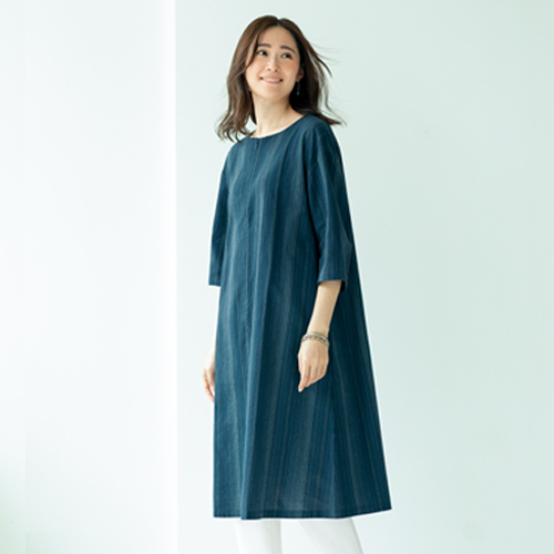 トップ > 衣料品・衣料雑貨 > 「三河木綿」しじら織り縞柄ワンピース ブルーグリーン系 M