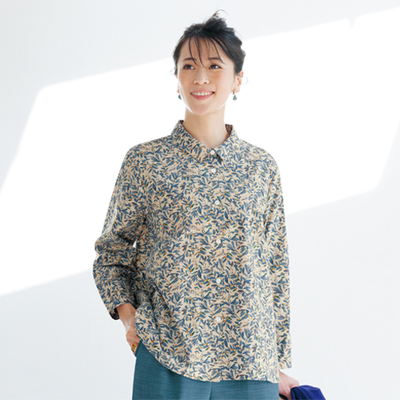 ブルーやパープルなど、淡い色彩が美しいリーフプリントのシャツは、体型が響かないAラインでゆったり着られるのに印象はスマート。きちんと見えする襟付きデザインです。