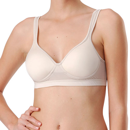 極細のシルクをハイゲージ編み機で編んだノンワイヤータイプのモールドブラジャー。シルクサテンのような光沢があり、アウターにも響きにくいのが特徴です。後ろにホック、肩にアジャスターがついています。